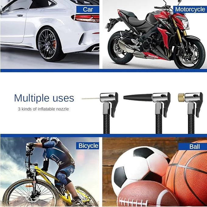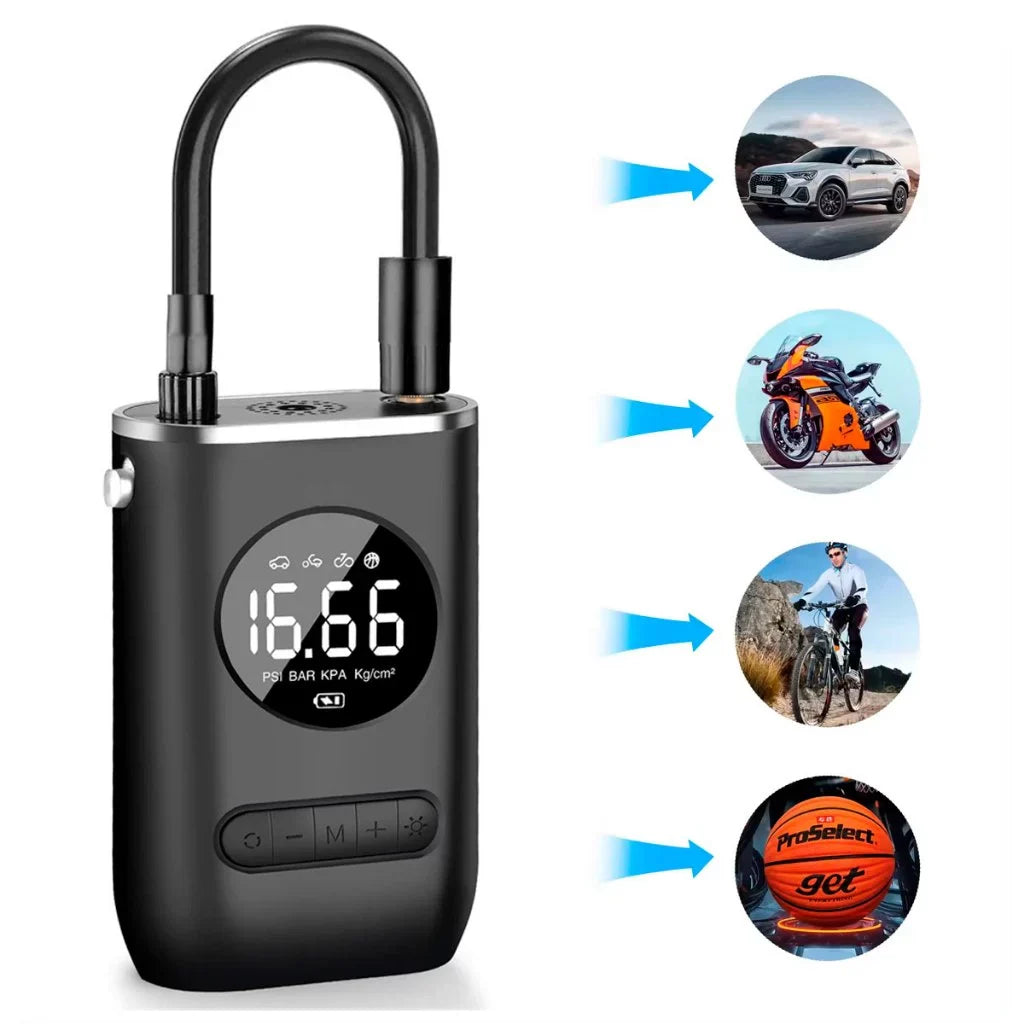 • Compacta e Portátil: Ideal para carros, motocicletas, bicicletas e bolas.