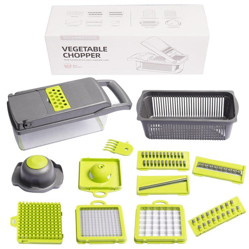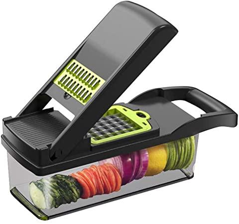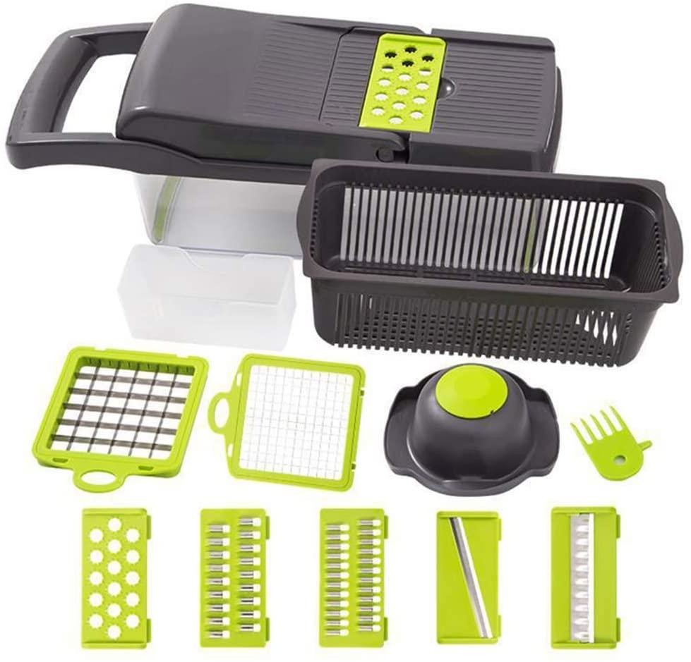 Nosso Cortador de Legumes | Multifuncional oferece todas as funcionalidades de vários aparelhos com suas 7 lâminas de aço inoxidável mutáveis. Essas lâminas podem cortar todos os tipos de vegetais, ralar queijo, fatiar batatas e cortar frutas, até podem criar legumes em pasta ou purê de batatas, sendo fácil e prático de usar.